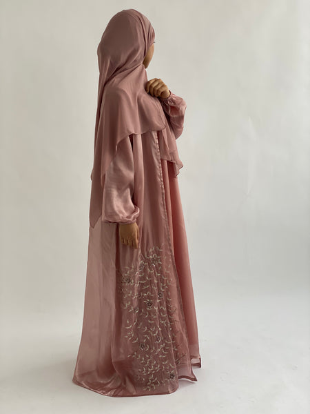 Our Jasmin set is perfect for special occasions detailed with floret handwork and balloon sleeves to add a dreamy finish. This set includes a matching inner dress that is lined as well as a matching hijab.